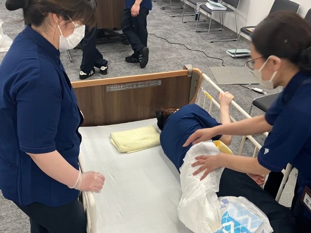 昨日も半日ほど現場で研修の様子を拝見させていただきましたが、オムツ交換やトイレのご案内のロープレでした。実務研修にはホームで介護職として働いている先輩スタッフにも講師として参加いただき、現場では「こういうふうにやっているよ」と、直接生の声をアドバイスいただいています。